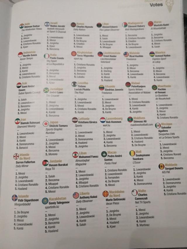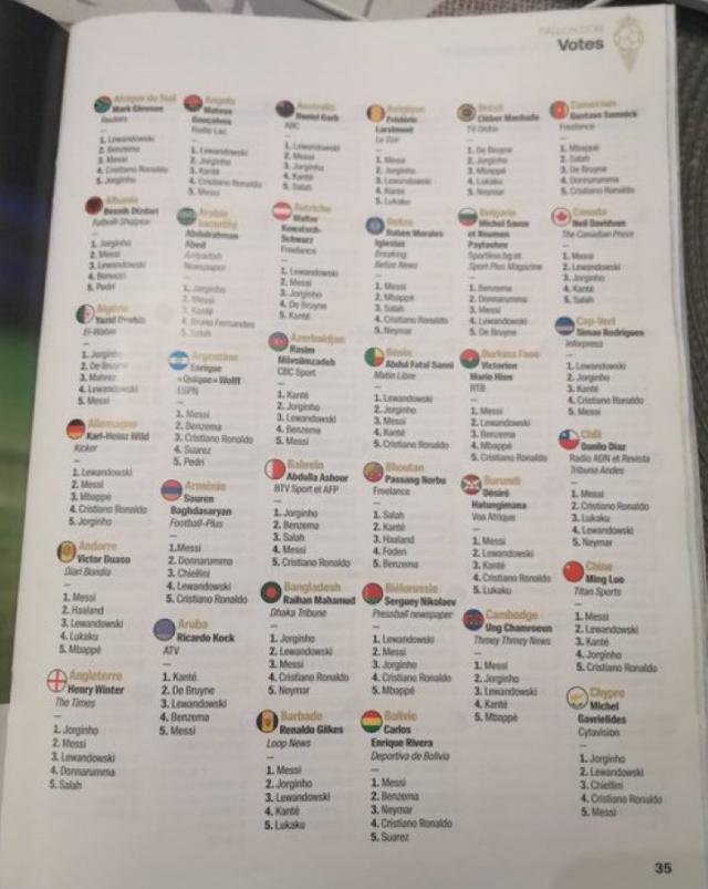 首先,作为主办方的《法国足球》杂志,其主编费雷第1名投给了莱万,第2名是梅西,然后是本泽马、若日尼奥和姆巴佩。除了照顾两名法国同胞,费雷的排序可以说非常符合主流和评选的标准。但到了利益相关国,投票似乎就有点变味了。例如,阿根廷评委把票投给了梅西、本泽马、C罗、苏亚雷斯和佩德里,完全无视莱万和若鸟!